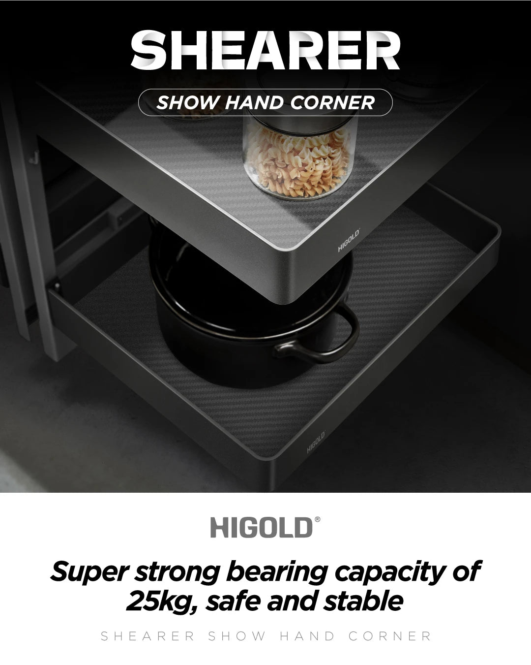 The Shearer PRO Show Hand Magic Corner Kitchen Storage from Higold boasts of premium-quality construction. Built with superior aerospace-grade aluminium frame, it is well-known for being a sturdy load-bearing blind corner solution. Its overall design allows for efficiency as you proceed with food preparation and other work in your kitchen.
